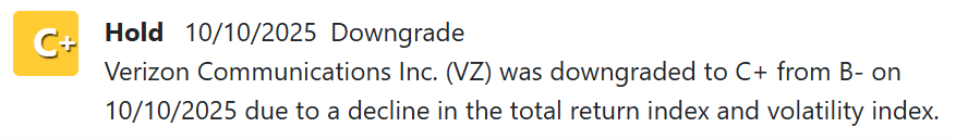 Verizon dropped off for the simple reason that its Weiss Rating dropped to a “Hold” on Oct. 10: