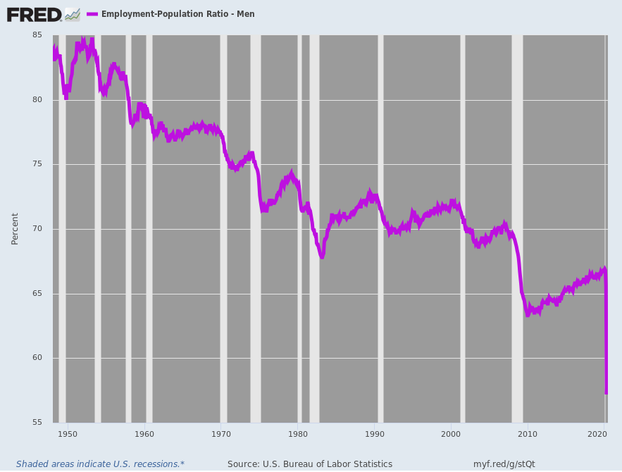 Consider that, while the Nasdaq Composite was ending the second quarter at an all-time high — since eclipsed, of course — the share of American males actually employed dropped to 58.6% in May, an all-time low going back to 1948.