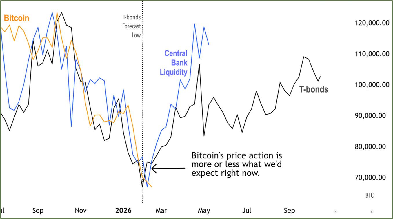 The weekly structure suggests Bitcoin likely made that low during the week of Feb. 2 — specifically on Feb. 5. That aligns closely with the bond markets’ forecast (marked by the black dotted vertical line).