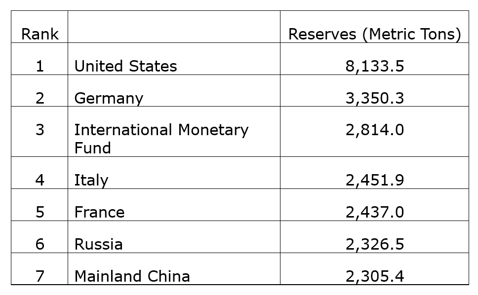 The World Gold Council, ranks official gold reserves of 100 countries. China weighs in at a respectable, if unremarkable, No. 7 on this list — with 2,305 metric tons.
