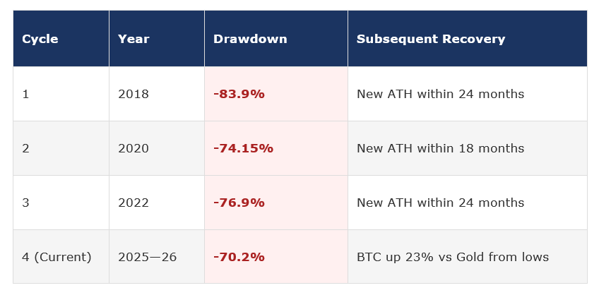 The current drawdown, clocking in at approximately 70.2%, falls squarely within this historical range.
