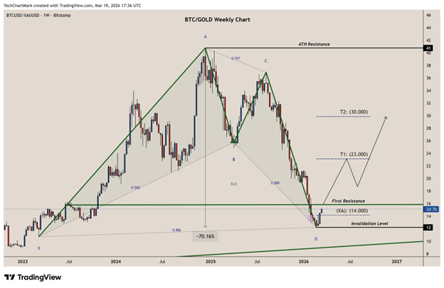 The current setup has already fired the first confirming shot: BTC has gained approximately 23% against gold from its recent lows. That suggests the trough is either in or very close.