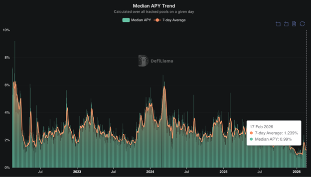 The median APY trend in crypto, based on DeFiLlama data, is barely 1%.