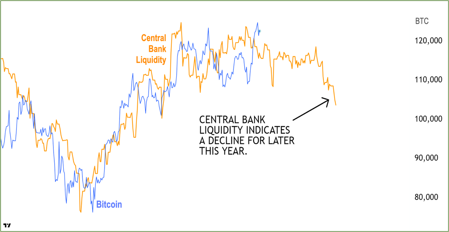As you can see, Central Bank Liquidity — an indicator that leads Bitcoin by roughly 88 days — has basically been flatlining for months.
