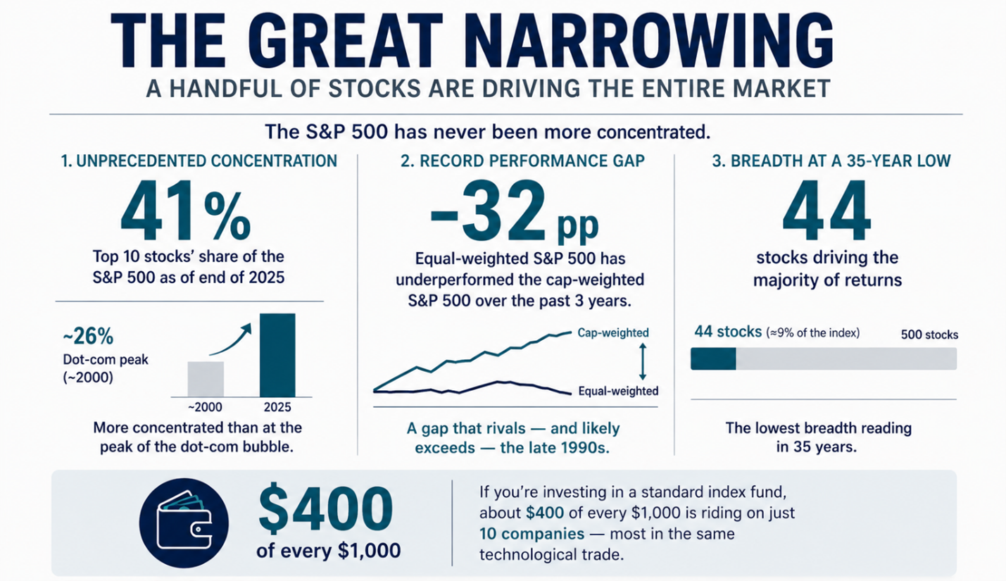 The equal-weighted S&P 500 — where every company carries the same influence — has underperformed its market-cap-weighted counterpart by roughly 32 percentage points over the past three years. That gap now exceeds the outperformance seen in the late 1990s.