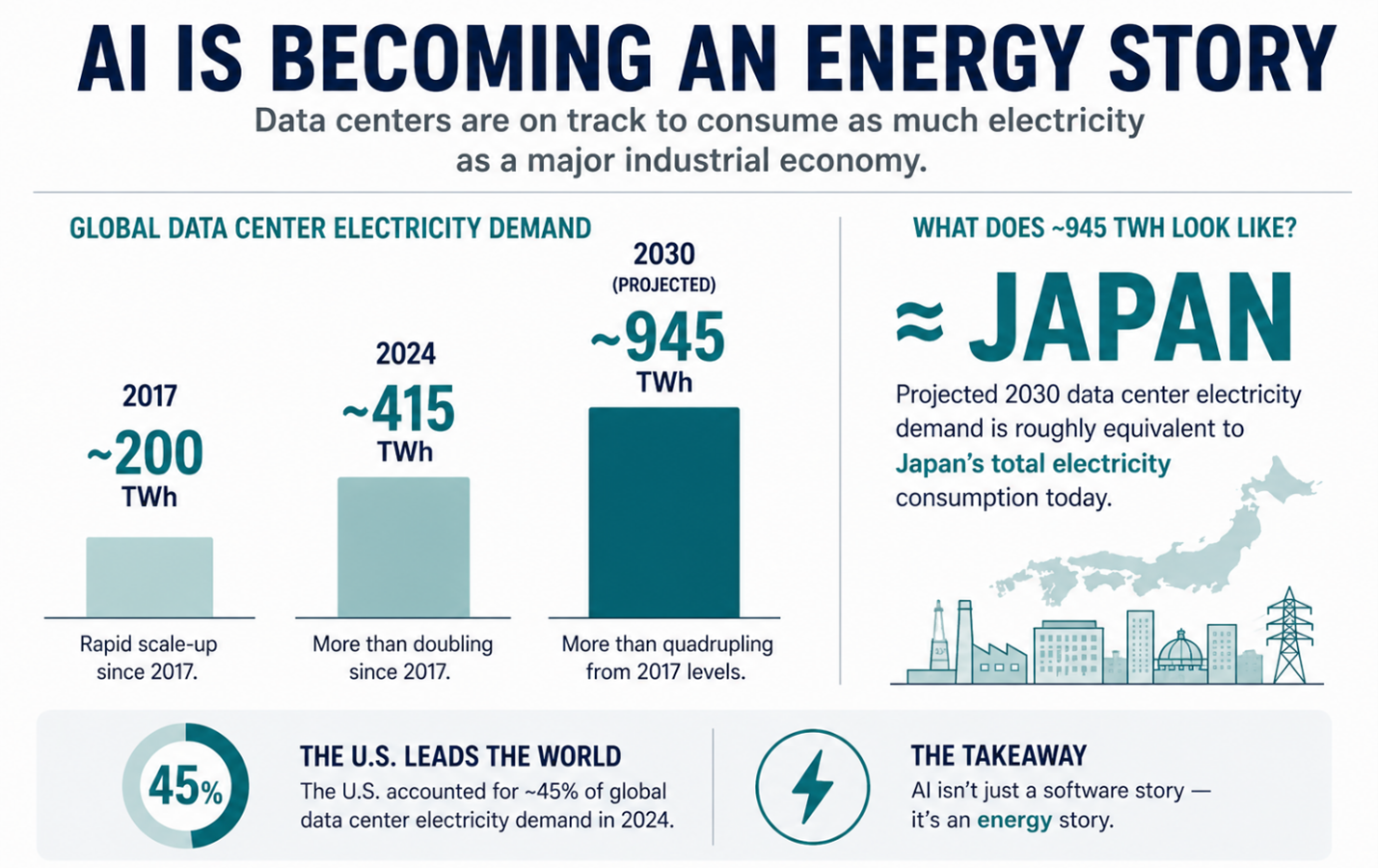 By 2030, the International Energy Agency projects global data center consumption will roughly double, reaching approximately 945 TWh — comparable to Japan's entire annual electricity consumption today.