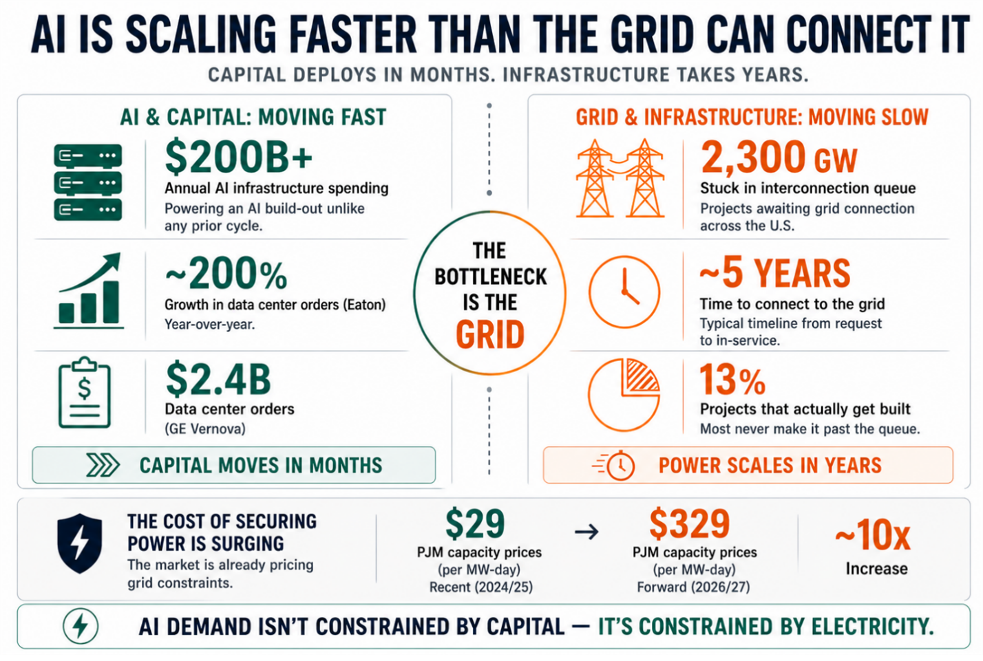 When the AI buildout hits power constraints at scale, the effect will not spread evenly. It will concentrate. A data center campus that cannot get grid connection cannot generate revenue. A hyperscaler that has committed tens of billions in CapEx guidance cannot arbitrarily slow the burn or accelerate delivery of electrons that the grid is not yet positioned to supply.