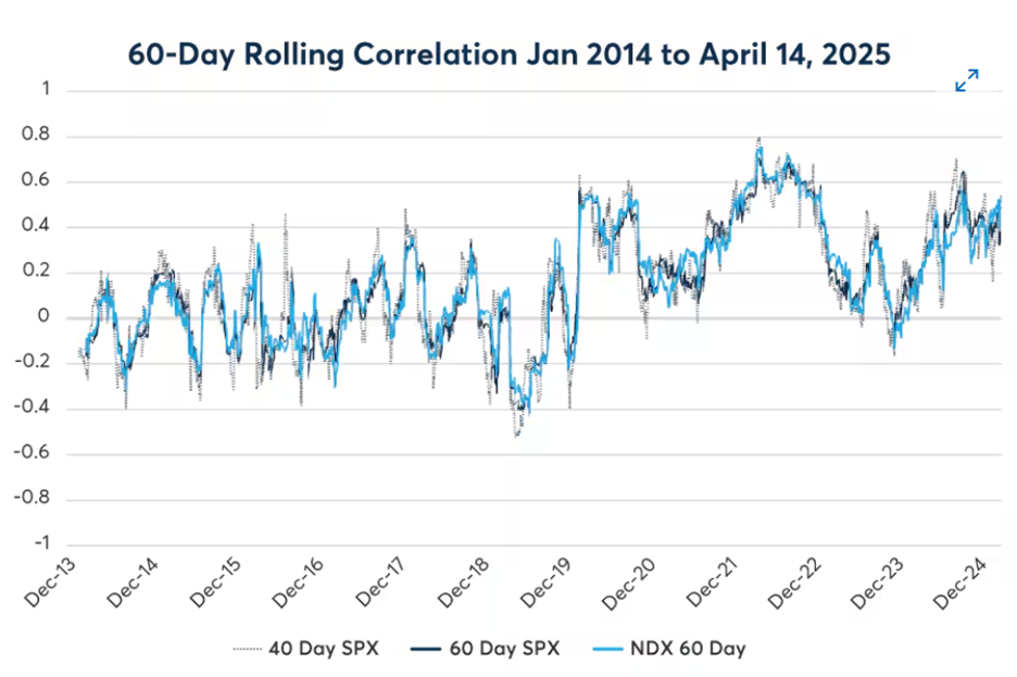 - In 2025, Bitcoin's rolling correlation with the Nasdaq-100 more than doubled its 0.23 average from the prior year.