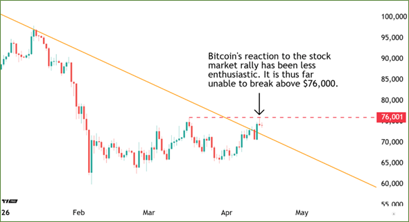 Well, observe the dashed red line (above) which marks the $76,000 level. This is where Bitcoin topped out, during one of the most intense weeks of the war. After briefly touching this level on March 17, it reversed sharply into a low at $65,000 on March 29.