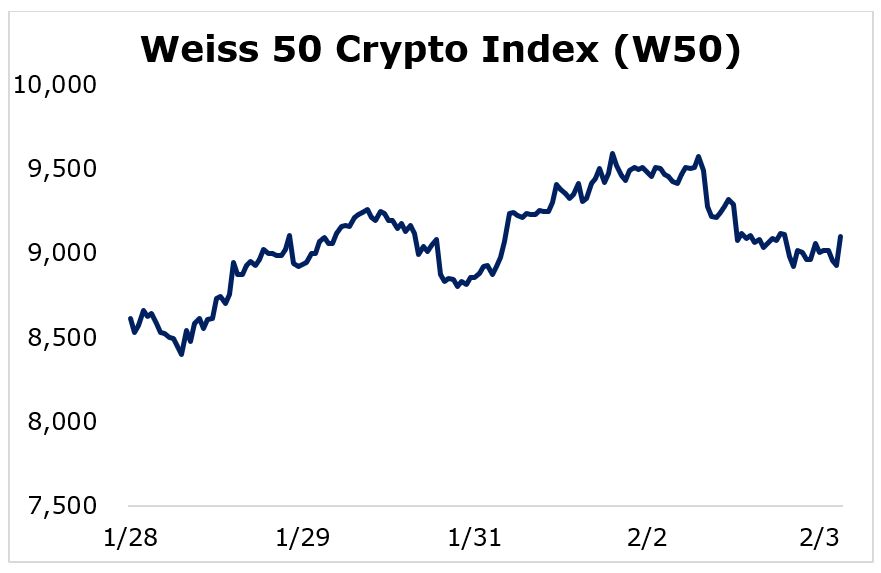 The Weiss 50 Crypto Ex-BTC Index (W50X) increased 7.75%, as Bitcoin slightly underperformed the broader market.