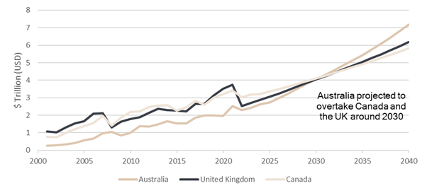 Australia’s superannuation system manages roughly $4.5 trillion AUD ($3.1 trillion USD), with projections indicating it could reach $5.7 trillion AUD, or $3.9 trillion USD, by 2030.