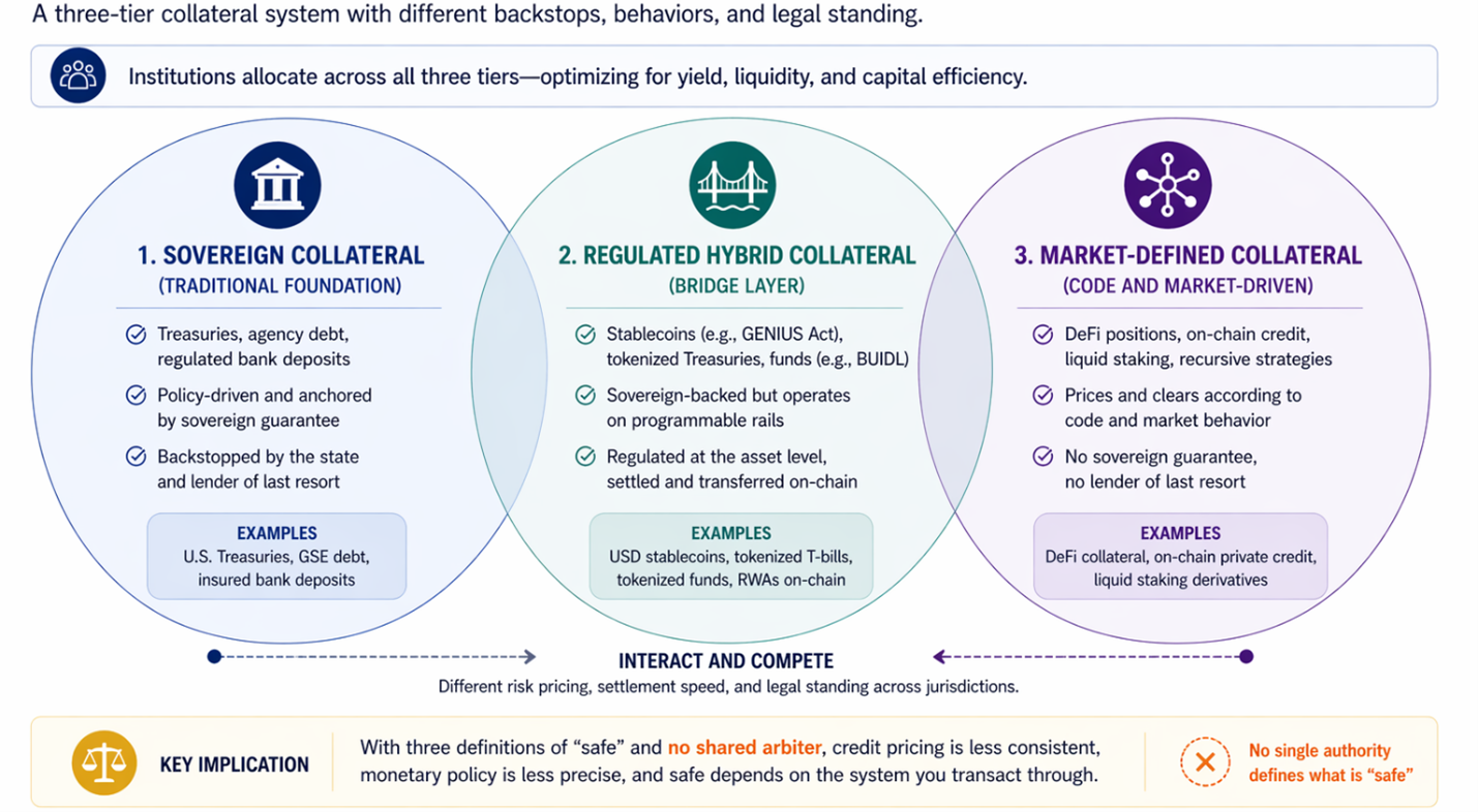 Finally, there’s the market-defined collateral tier. This is where DeFi users live. Where unregulated DeFi positions, recursive liquid staking strategies, on-chain private credit counts as collateral. Here, prices and clears are according to code and market behavior, with no sovereign guarantee and no lender of last resort.