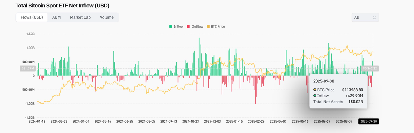 In just the last two days of September, spot Bitcoin ETFs saw $950 million in inflows, erasing the $900 million in outflows from earlier that week.