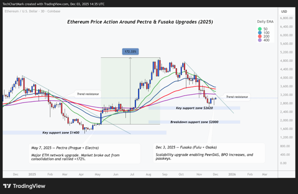 Before we drop into the deeper technical pieces of Fusaka, it’s worth taking a quick look at how Ethereum has behaved around previous network upgrades.
