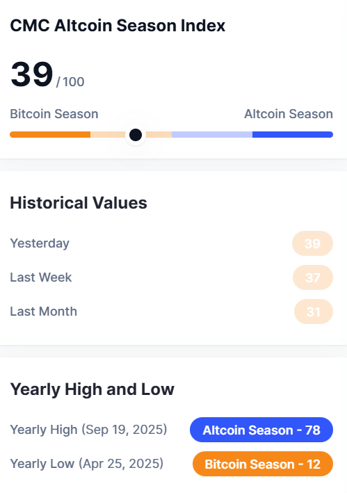 Bitcoin dominance remains elevated, and the index is still far below the level that would indicate a broad altcoin rally.
