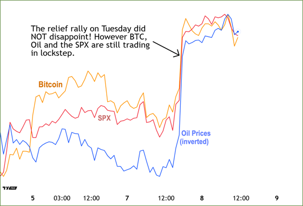 All three assets moved together, rising sharply as news of a two-week ceasefire followed by peace talks hit the wires.