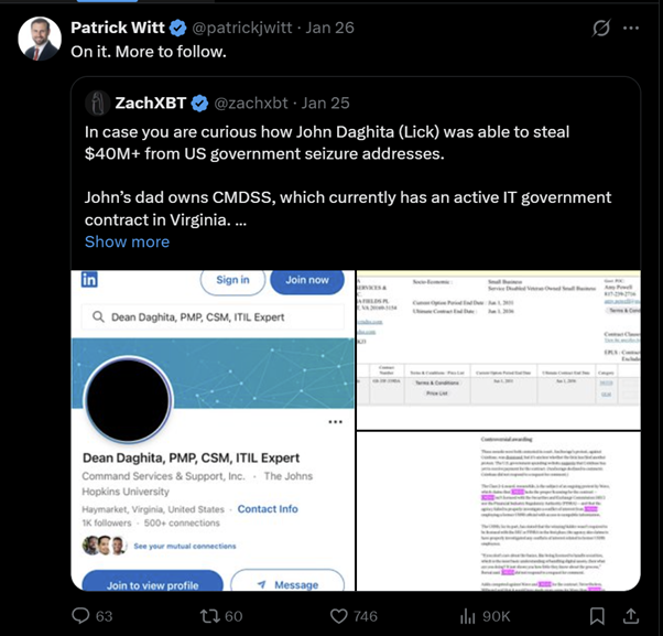 Following Witt’s response, the U.S. Marshals Service confirmed it had opened an investigation into potential unauthorized access to government-owned cryptocurrency wallets.