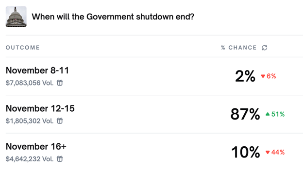Prediction markets on Polymarket now give an 87% probability that the shutdown ends between Nov. 12 and Nov. 15.