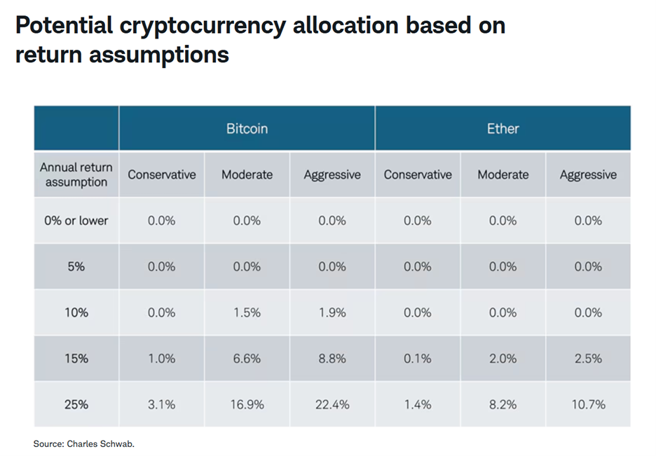 Schwab’s own research is now legitimizing crypto allocations in a portfolio, suggesting that "moderate" investors can consider a 6.6% BTC and 2% ETH allocation.