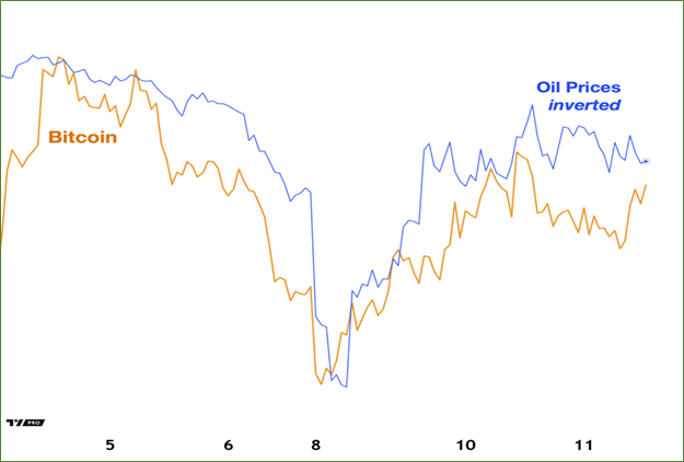 In other words, oil up = Bitcoin down.