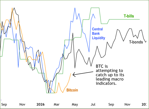 Looking back, it appears that the Iran war caused a roughly two-week distortion in the price of Bitcoin as it sold off the second half of March. Whereas macro indicators pointed to a steady rally into May.