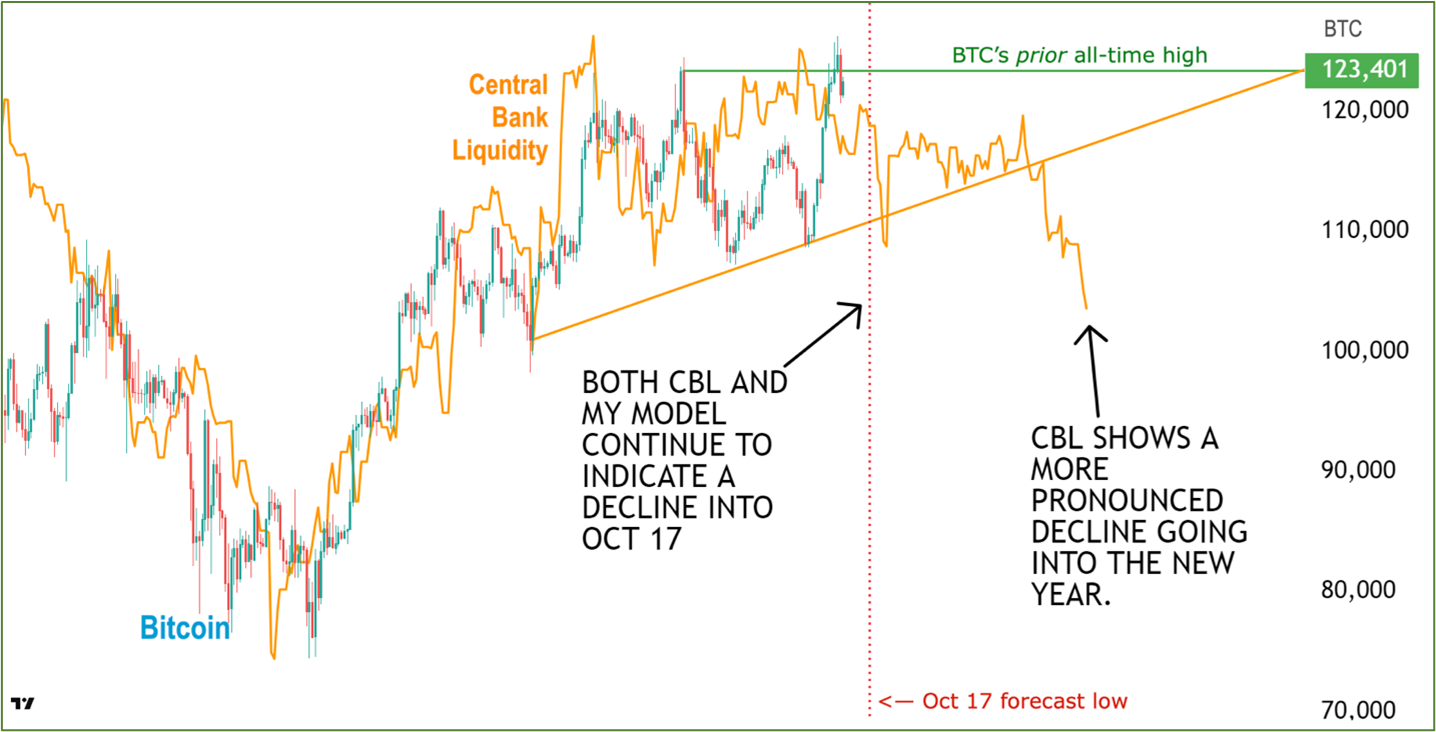 Central Bank liquidity (CBL) tends to mirror Bitcoin’s (BTC, “A-”) price path 88 days in advance. This makes it a very useful leading indicator.