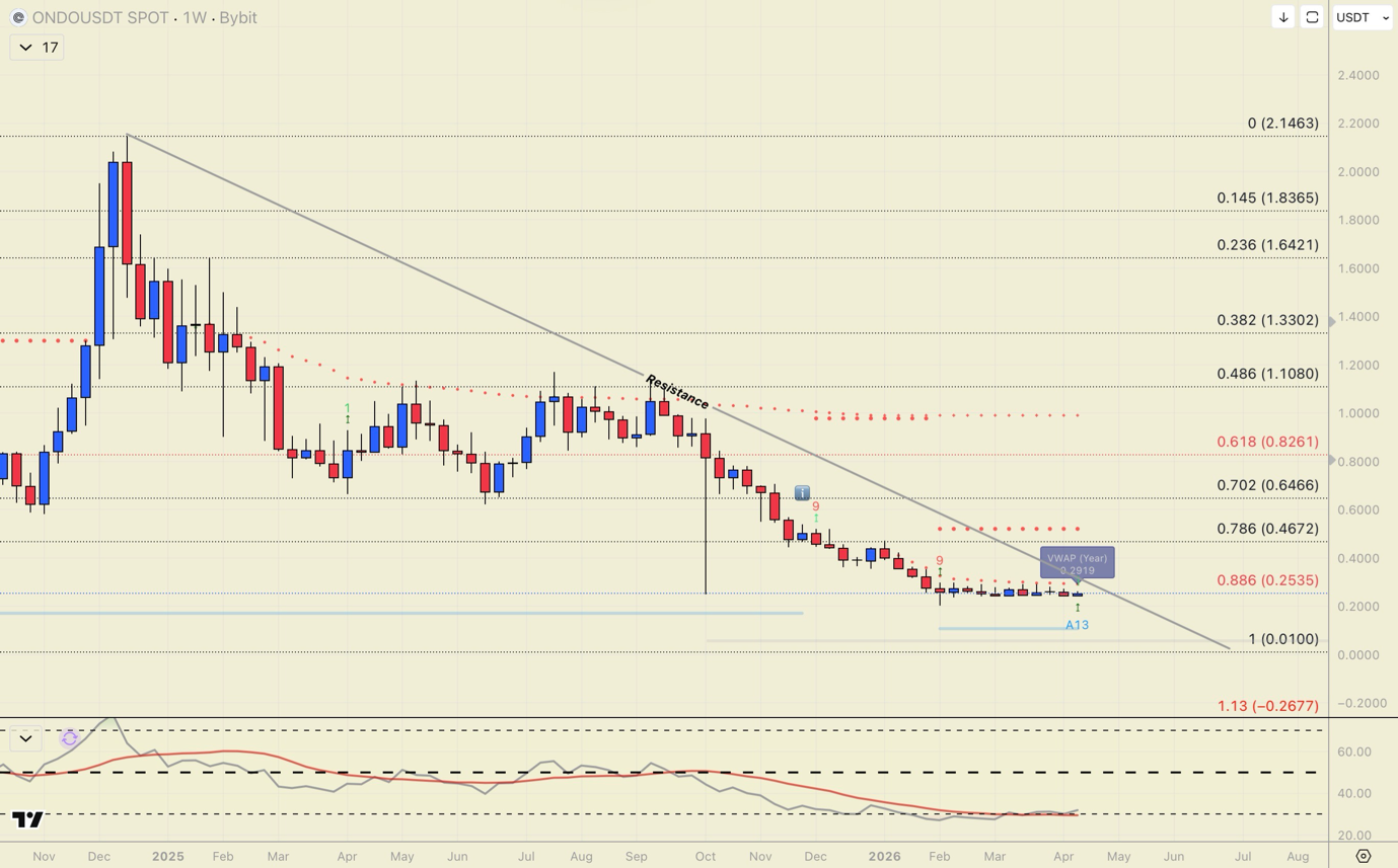 From a higher timeframe perspective (weekly), ONDO has been in a clear downtrend since its initial expansion phase, with price consistently respecting a descending trendline.