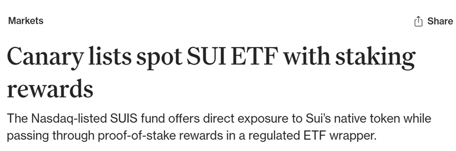 The Grayscale Investments Sui Staking ETF (GSUI) began trading on the NYSE Arca, while the Canary Capital Staked SUI ETF (SUIS) launched on the Nasdaq.