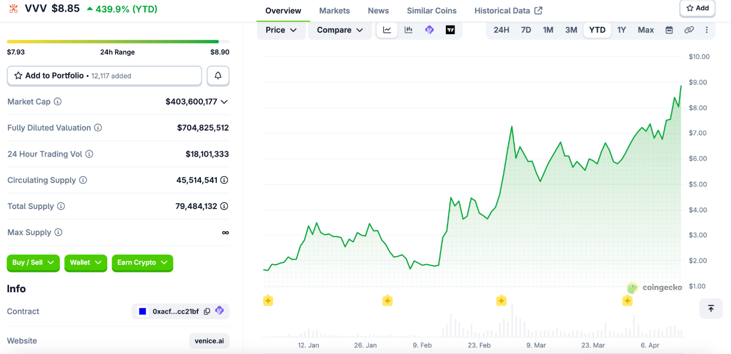 Venice AI (VVV, “B”) has emerged as one of the few tokens that consistently attracts capital during every AI expansion.