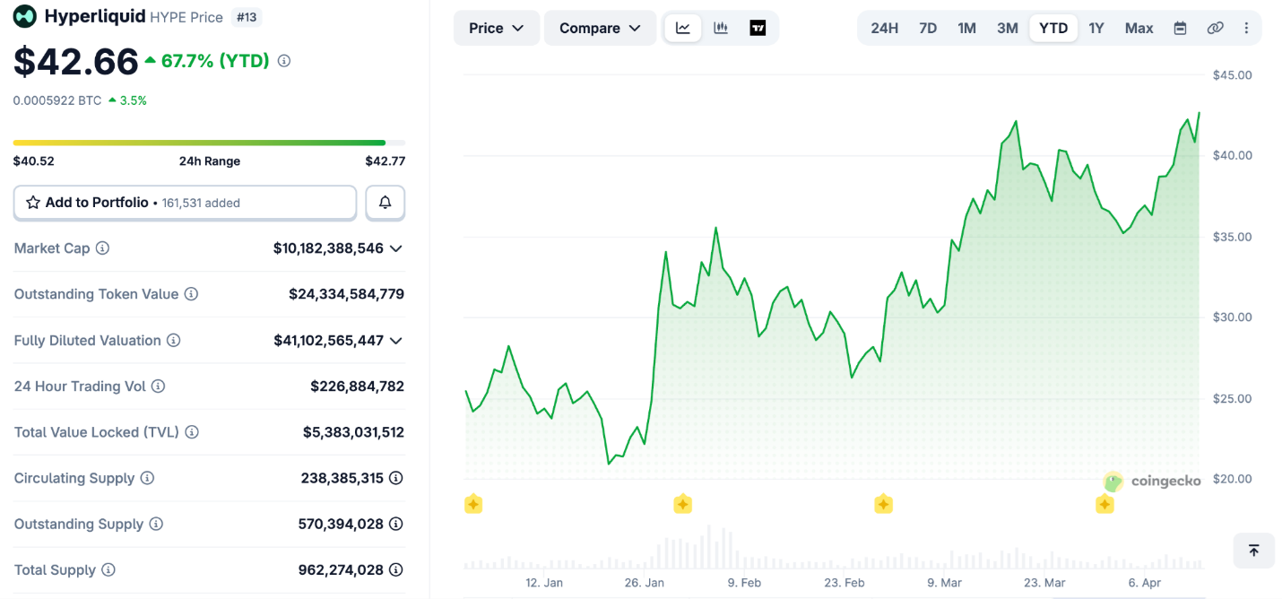 VVV is up 440% year to date. HYPE has risen 68% in that time. Both are absorbing long-term capital that wants exposure where activity is actually happening.