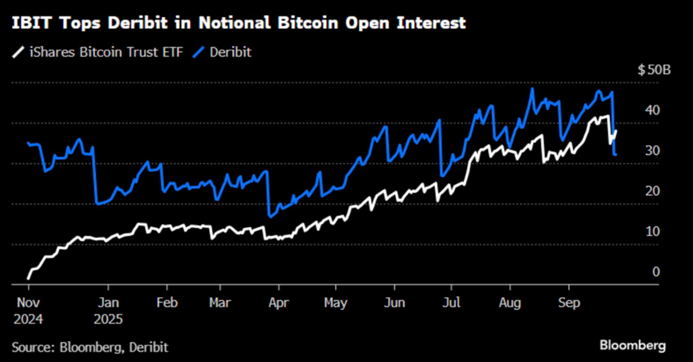 BlackRock’s iShares Bitcoin Trust ETF (IBIT) has overtaken Deribit as the largest Bitcoin options venue in the world, with $38 billion in open interest versus $32 billion.