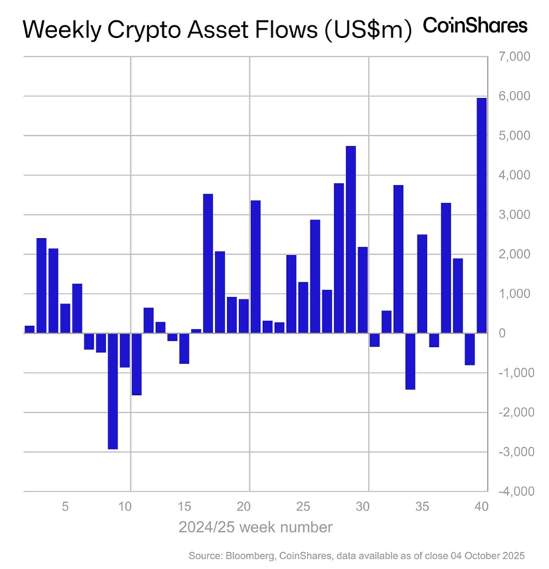 Global crypto ETFs attracted $5.95 billion in net inflows last week — an all-time high, according to CoinShares.