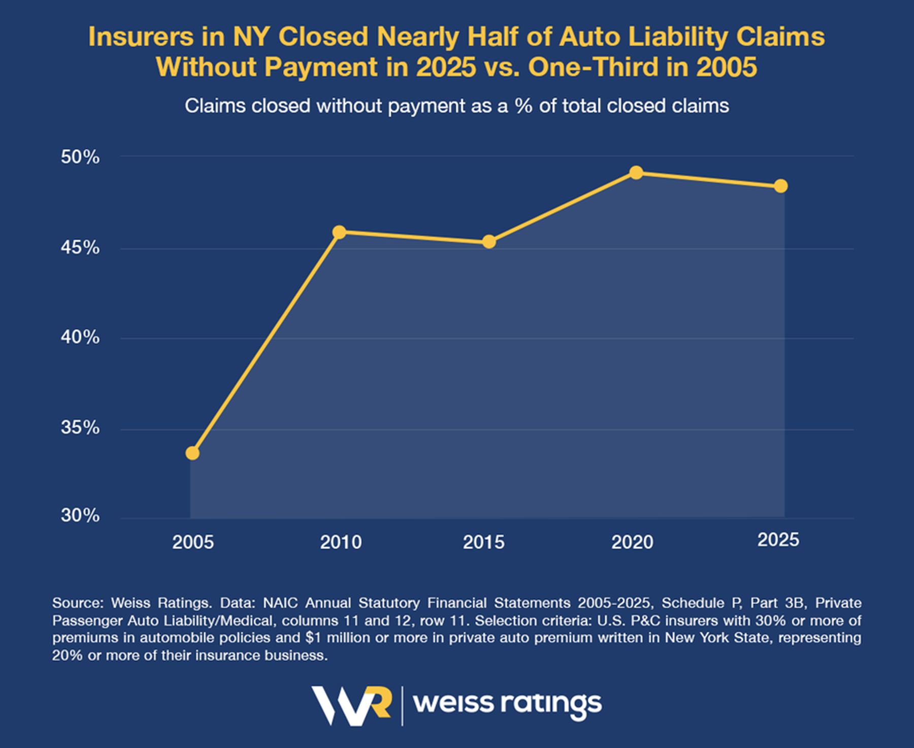 The report, requested by Citizens Action of New York, shows that auto insurers operating in the state closed 48.6% of liability claims in 2025 without payment to policyholders, up substantially from 33.6% in 2005.
