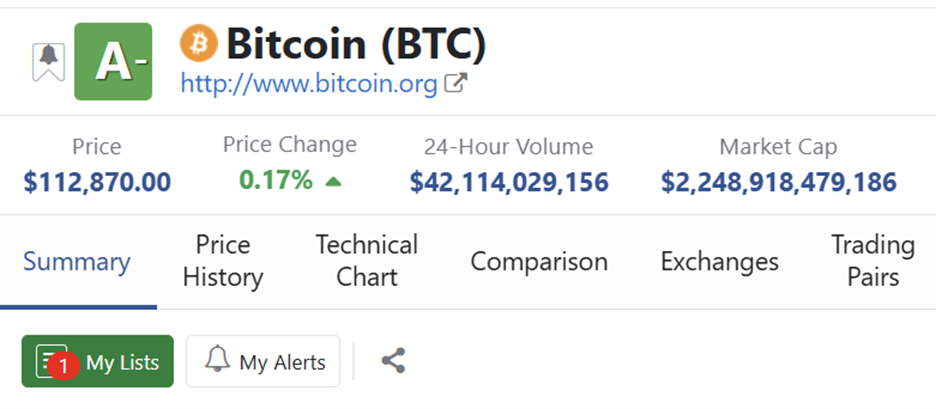 Just click on a crypto to go to its data page. That’s where you’ll find the My Lists and My Alert buttons at the top, right under the rating and real-time price.