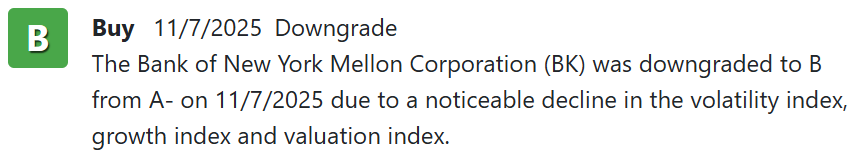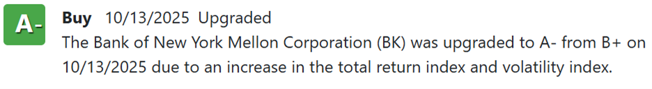 And while it remains a “Buy” — and therefore should continue to outperform the market going forward — it was since downgraded slightly to the “B” range: