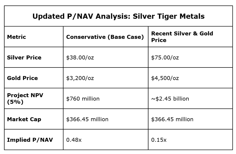 Using outdated, too-low gold and silver prices, Silver Tiger is already cheap, with a P/NAV of 0.48 …