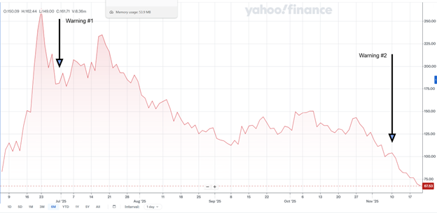 In fact, the stock dropped another 32% in just nine days after my Nov. 11 update and was down a full 61% since my original piece ran here on June 30.