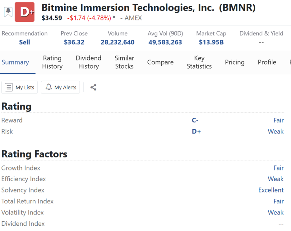 In fact, I recently initiated a small position in put options on BMNR — which the Weiss Ratings system has consistently ranked “Sell” — to profit from any further drop in the stock’s price.