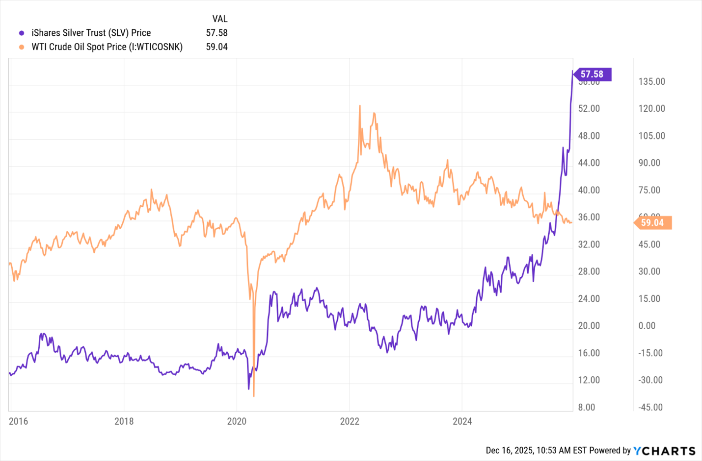 Oil has been declining throughout 2025. Silver has been exploding.