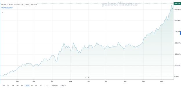 As you can see, the yellow metal had risen an astounding 65% from Jan. 1 through Oct. 20.