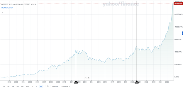 And take the yellow metal from $2,000 an ounce at the start of the breakout in the beginning of January 2024 to $6,000 an ounce or more without even breaking a sweat.
