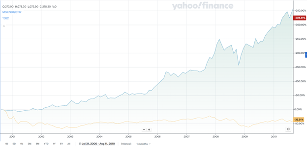 All told, it rose roughly 350% from the beginning of 2000 through the middle of 2011.