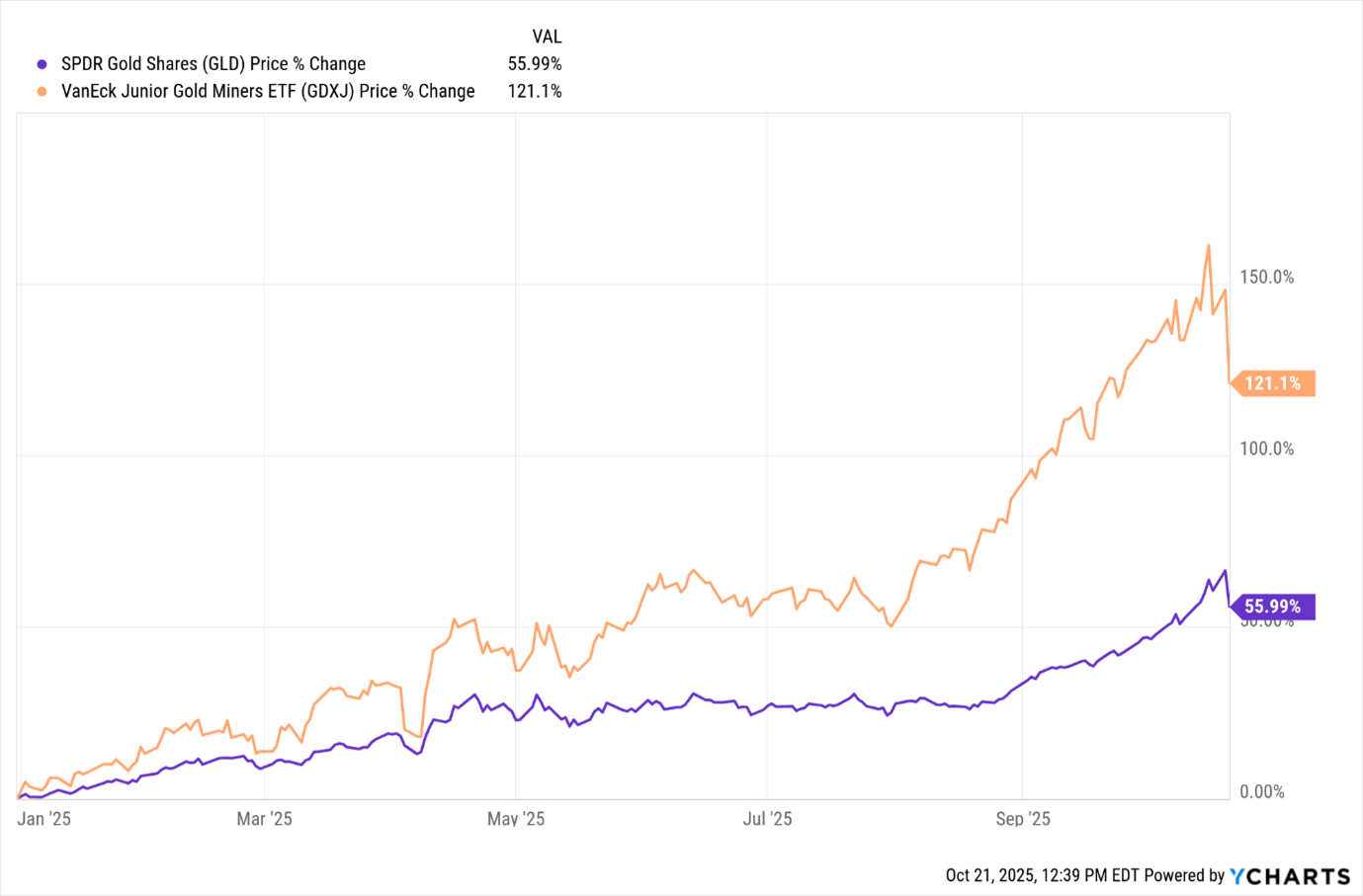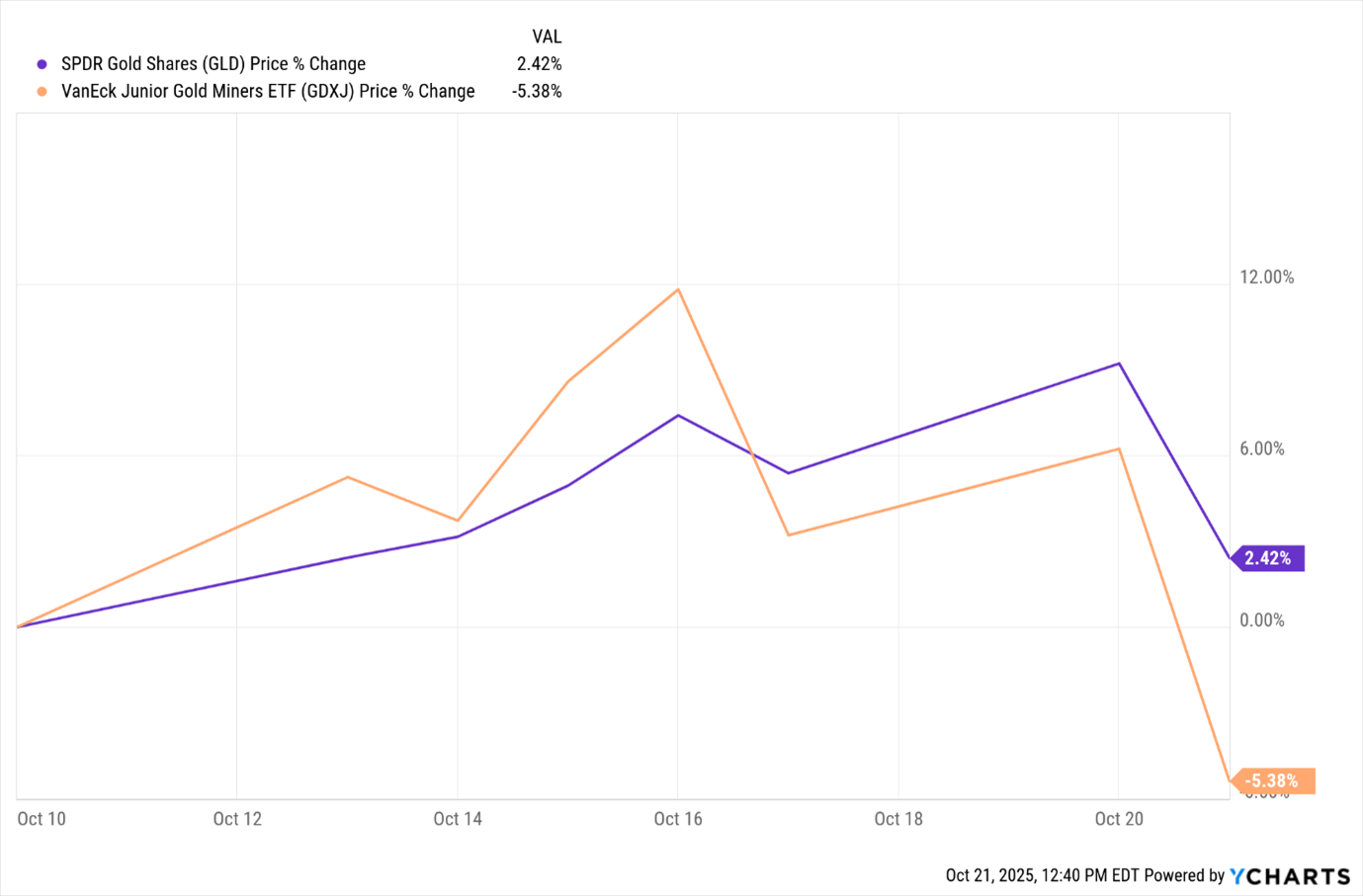So, these alternating gold swoons and booms could weigh on gold miner shares. That’s because they’re leveraged to the underlying metal.