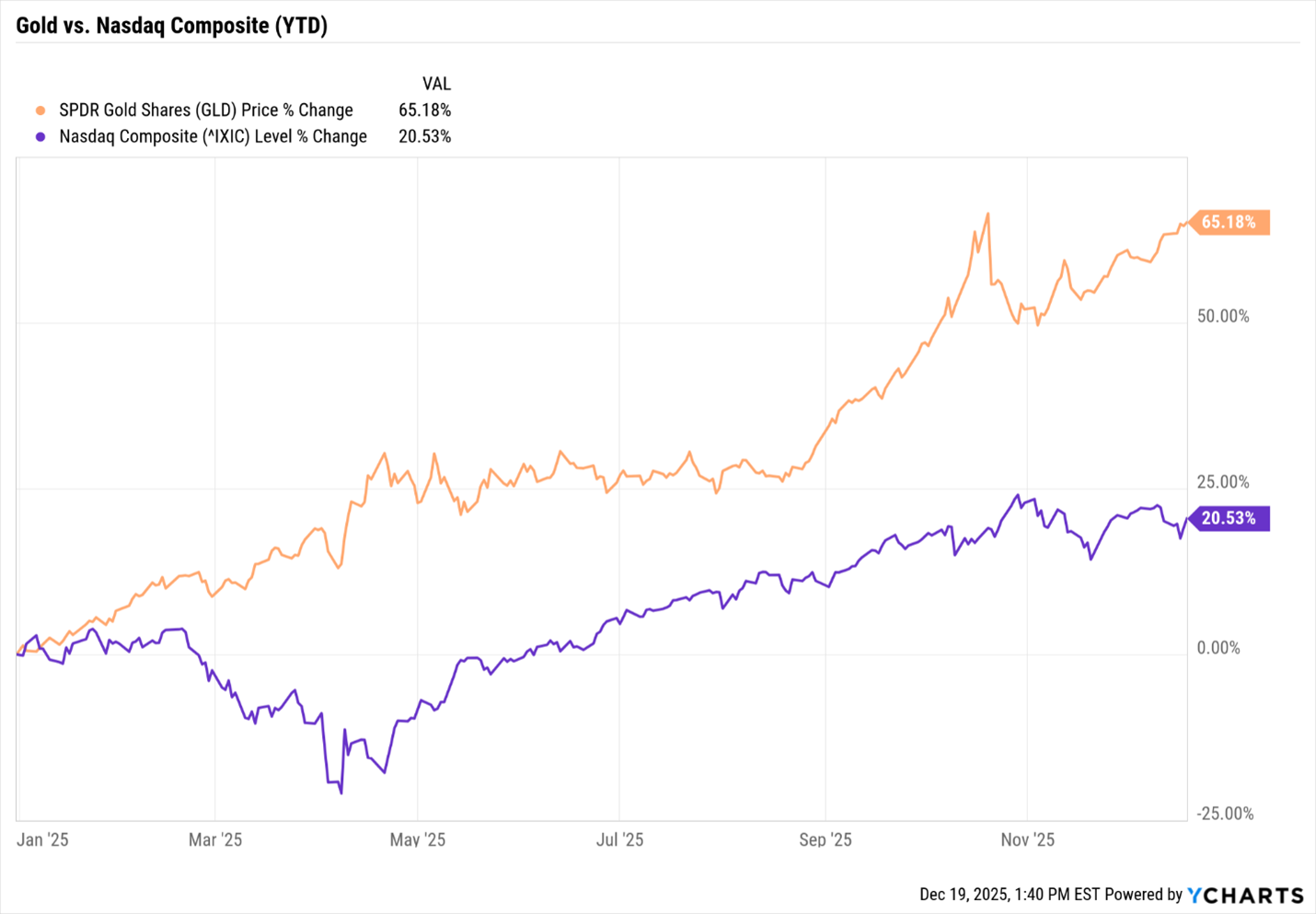 As you can see, gold — often derided as an antiquated “do nothing” asset — has absolutely trounced the most talked about class of stocks in 2025.