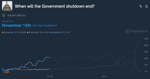 Bettors on Polymarket now give a 95% probability that the shutdown ends on Friday, Nov. 14.