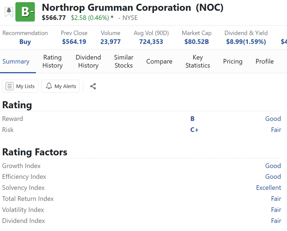 P.S. As you can see above, Weiss Ratings gives NOC a “B-” rating. That’s a solid “Buy.”