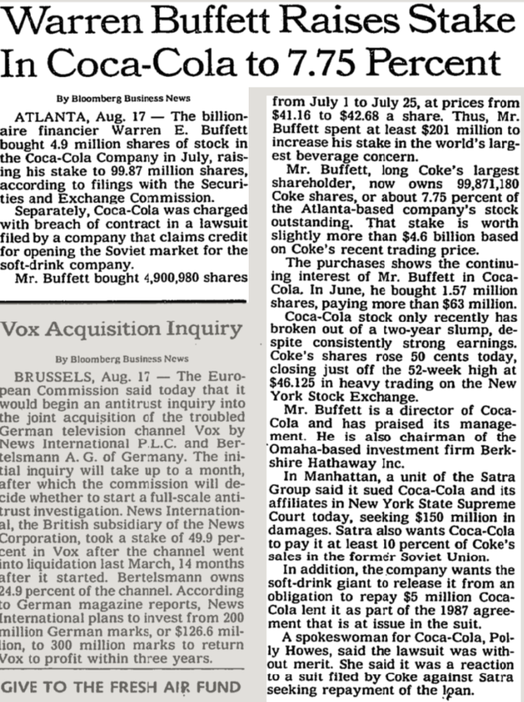 Warren Buffett began buying Coca-Cola (KO) stock in the summer of 1988.