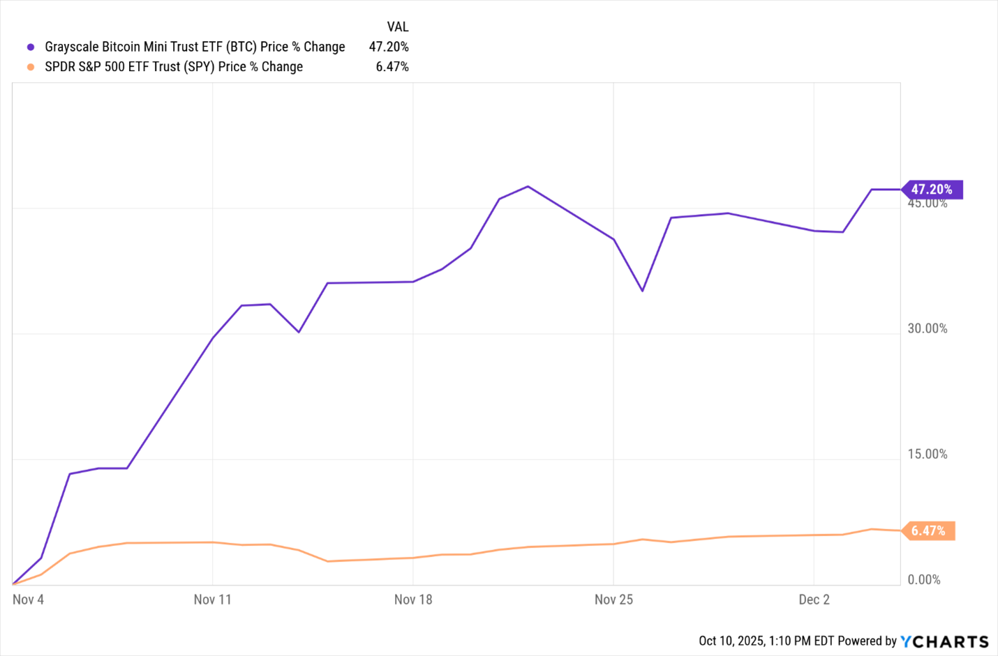 But if you chose the Grayscale Bitcoin Mini Trust ETF (BTC) instead, you’d have seen your money grow 47% in that same 30-day period.