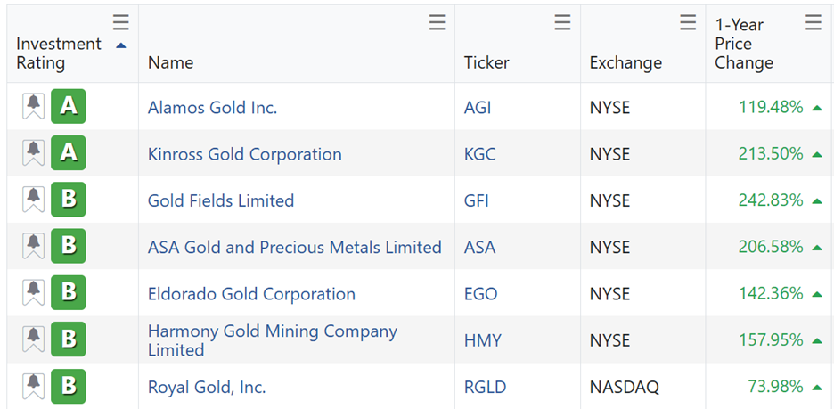 I searched gold stocks for those rated above a “C+” with “Buy” recommendations, and here’s how my search populated: