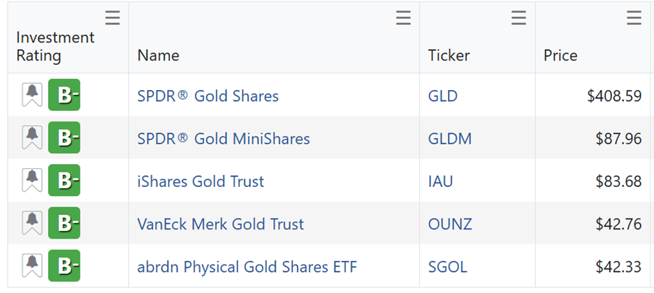 It’s one of the top five rated ETFs, all of which are “B-” in the precious metals/gold sector by Weiss.